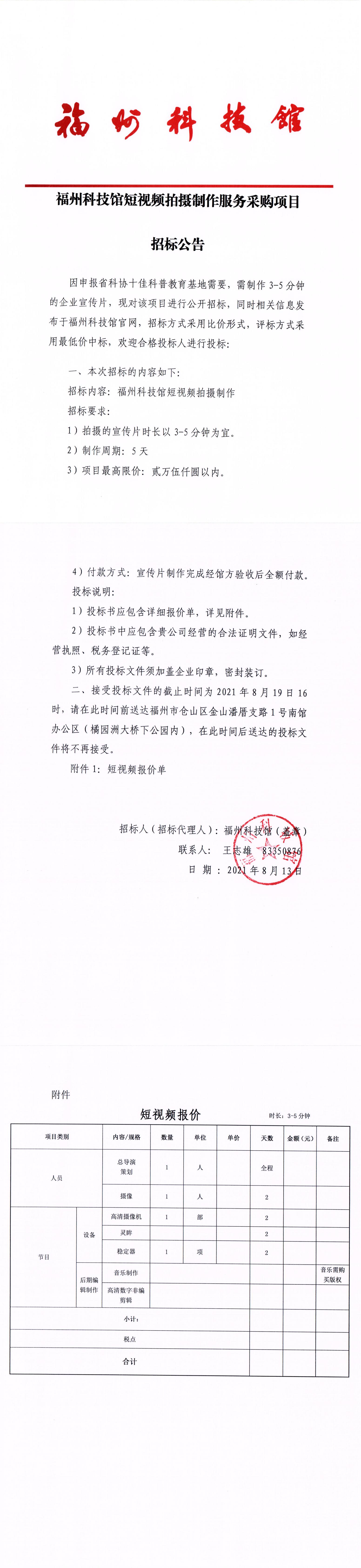 福州科技館短視頻拍攝制作服務采購項目招標公告